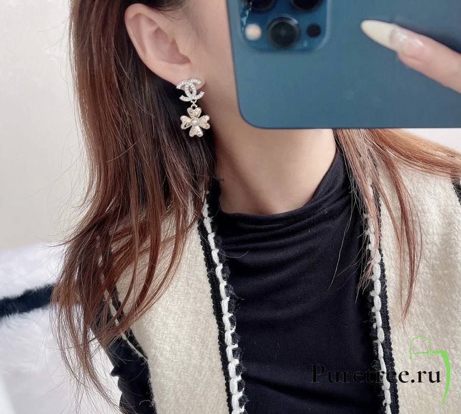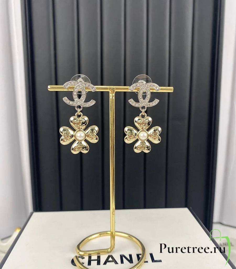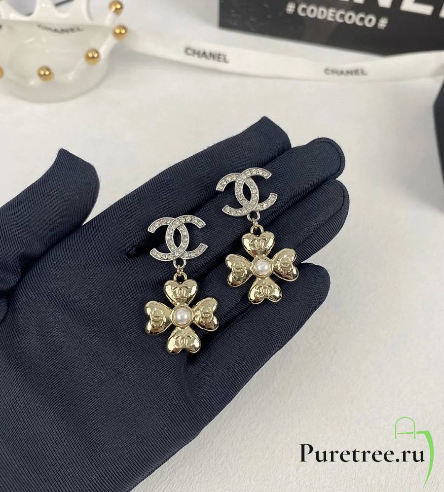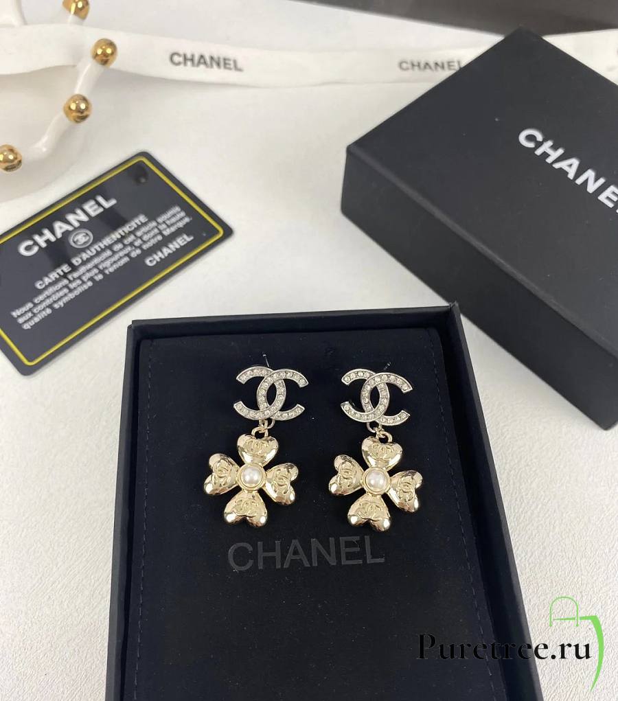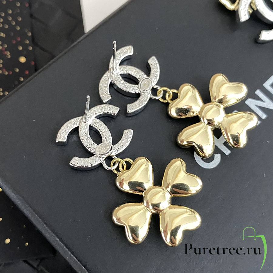 Chanel Double C Pendant Gold Four-Leaf Clover Earrings