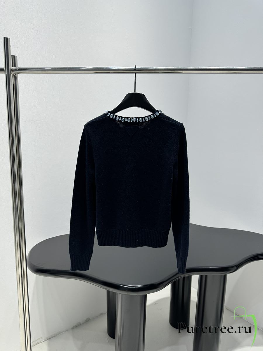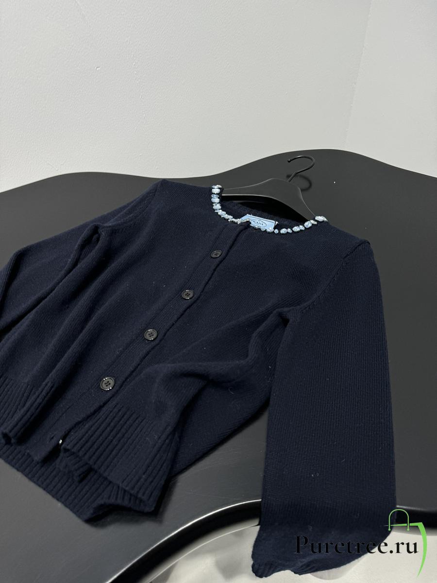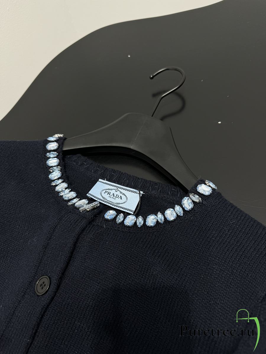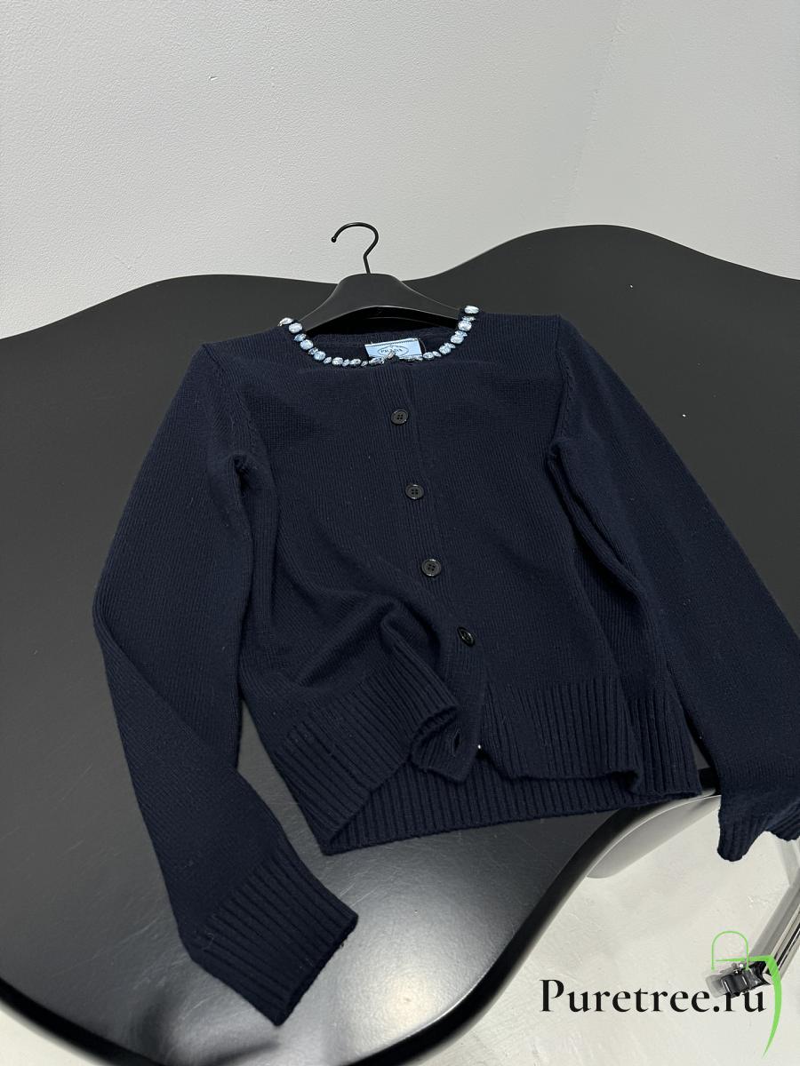 PRADA | Wool Rhinestone Crew Neck Cardigan Black